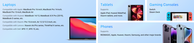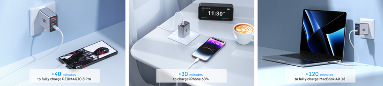 The dedicated 80W adapter recharges the REDMAGIC 8 Pro in about 40 minutes, MacBook Air 13 in about 120 minutes, and takes an iPhone to 60% in 30 minutes.