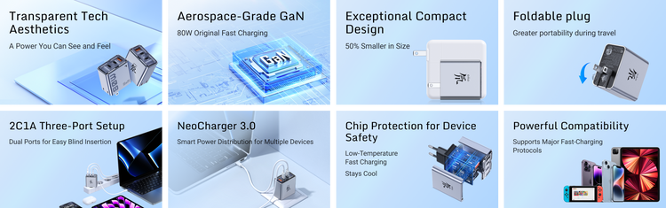 Equipped with NeoCharger 3.0 technology, this charger intelligently distributes power, dynamically adjusting current flow to meet the fast-charging needs of different devices while preventing overload, ensuring device safety.
