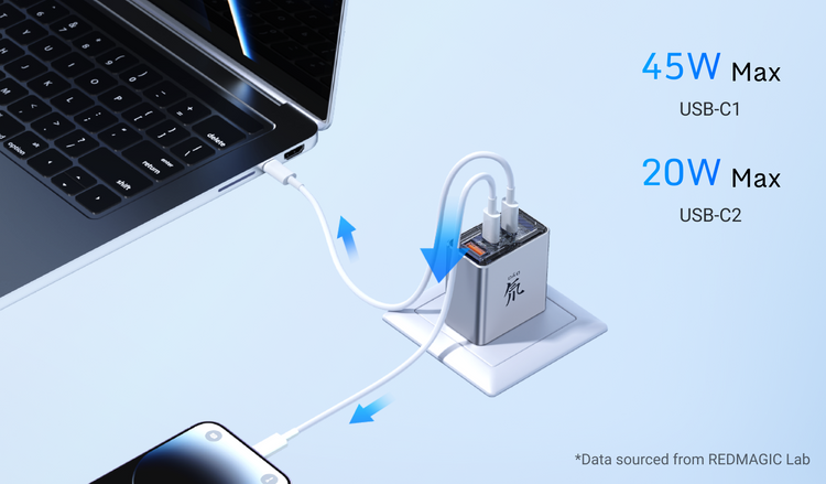 USB-C1+USB-A: 45W + 18W = 63W Max