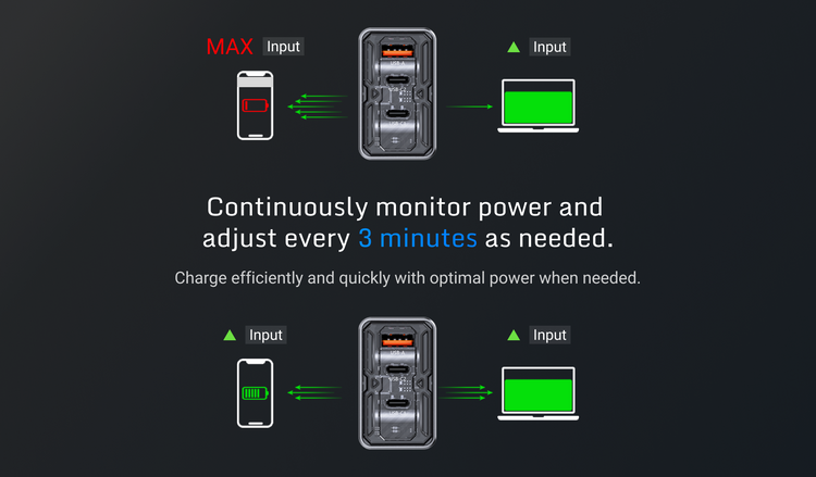 A combination of GaN chips and efficient cooling technology maintain low temperatures at all times. Smart temperature control accelerates heat dissipation, protecting your device and ensuring a safe and heatless charging experience.